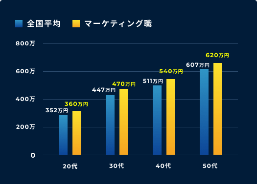 マーケター職は専門性が高く需要が高い一方で、人材不足が影響し、他職種と比較して平均給与を上回る傾向があります。そのため、給与アップの可能性も大いに期待できます。